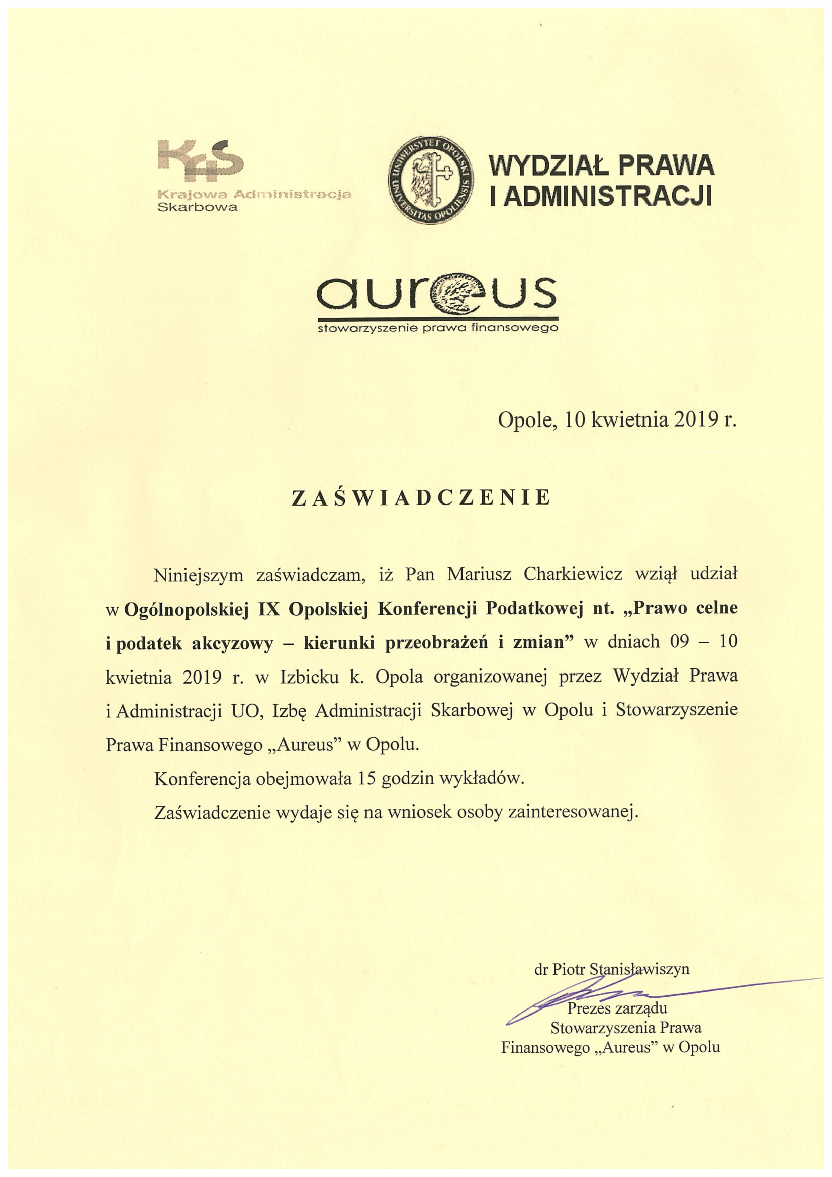 Ogólnopolska IX Opolska Konferencja Podatkowa, „Prawo celne, podatek akcyzowy oraz gry hazardowe – teoria i praktyka”, Izbicko, 8-10 kwietnia 2019 r.
