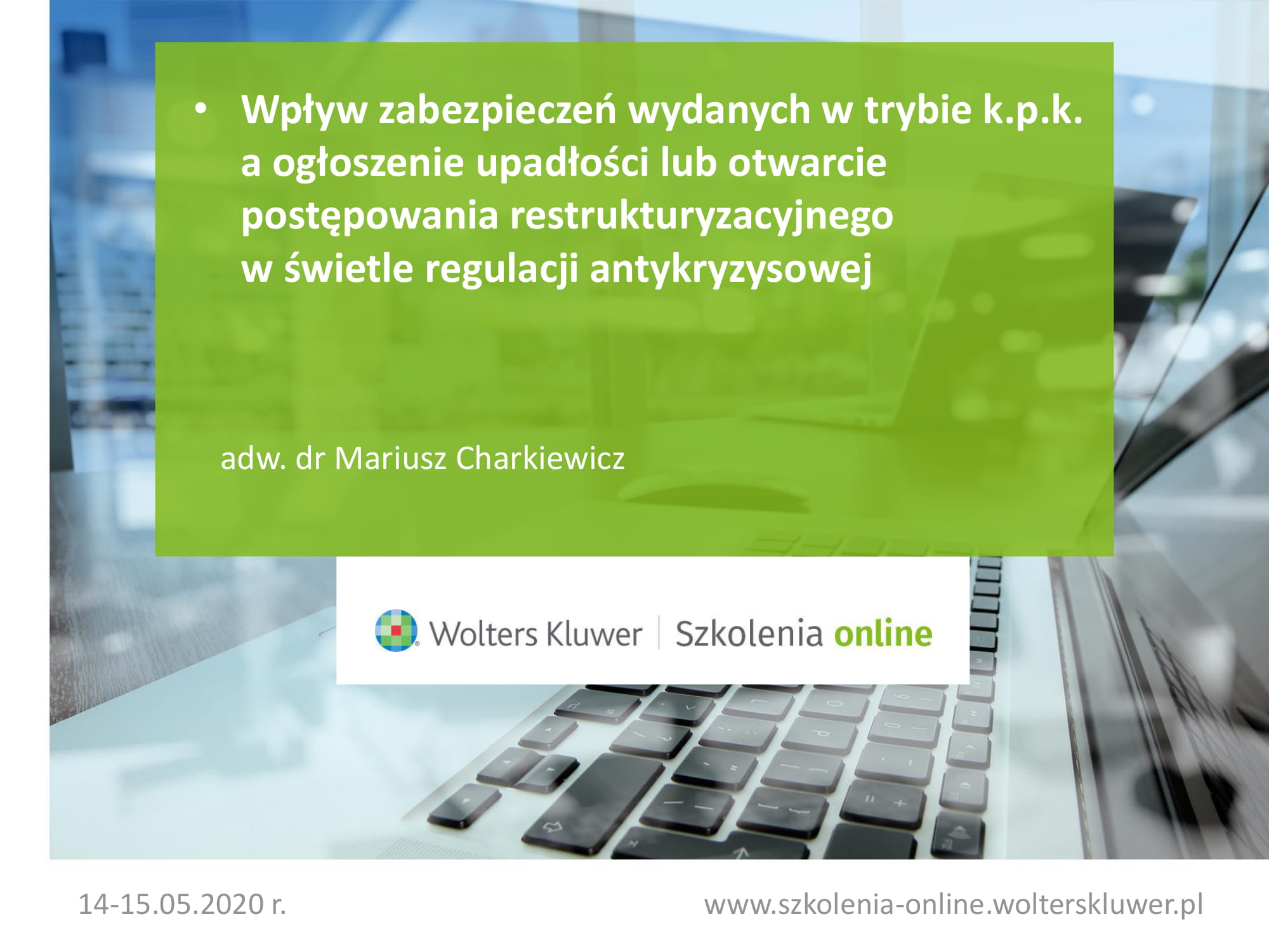 Webinarium Naukowe - Podatki a postępowanie upadłościowe i restrukturyzacyjne w dobie kryzysu i działań antykryzysowych [wygłoszony referat: M. Charkiewicz, Wpływ zabezpieczeń wydanych w trybie k.p.k. a ogłoszenie upadłości lub otwarcie postępowania restrukturyzacyjnego w świetle regulacji antykryzysowej], Szkolenie Online Wolters Kluwer, 14-15 maja 2020 r.
