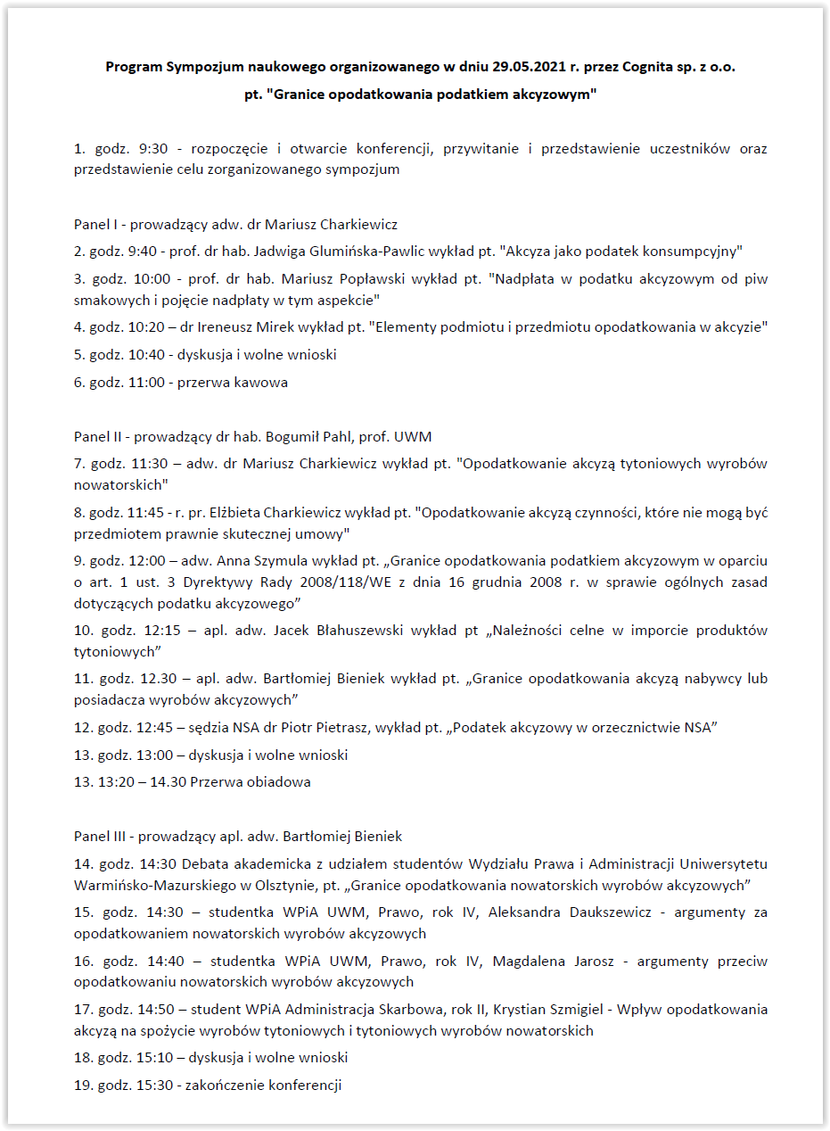 Sympozjum naukowe nt. "Granice opodatkowania podatkiem akcyzowym", Kazimierz Dolny, 29 maja 2021 r.