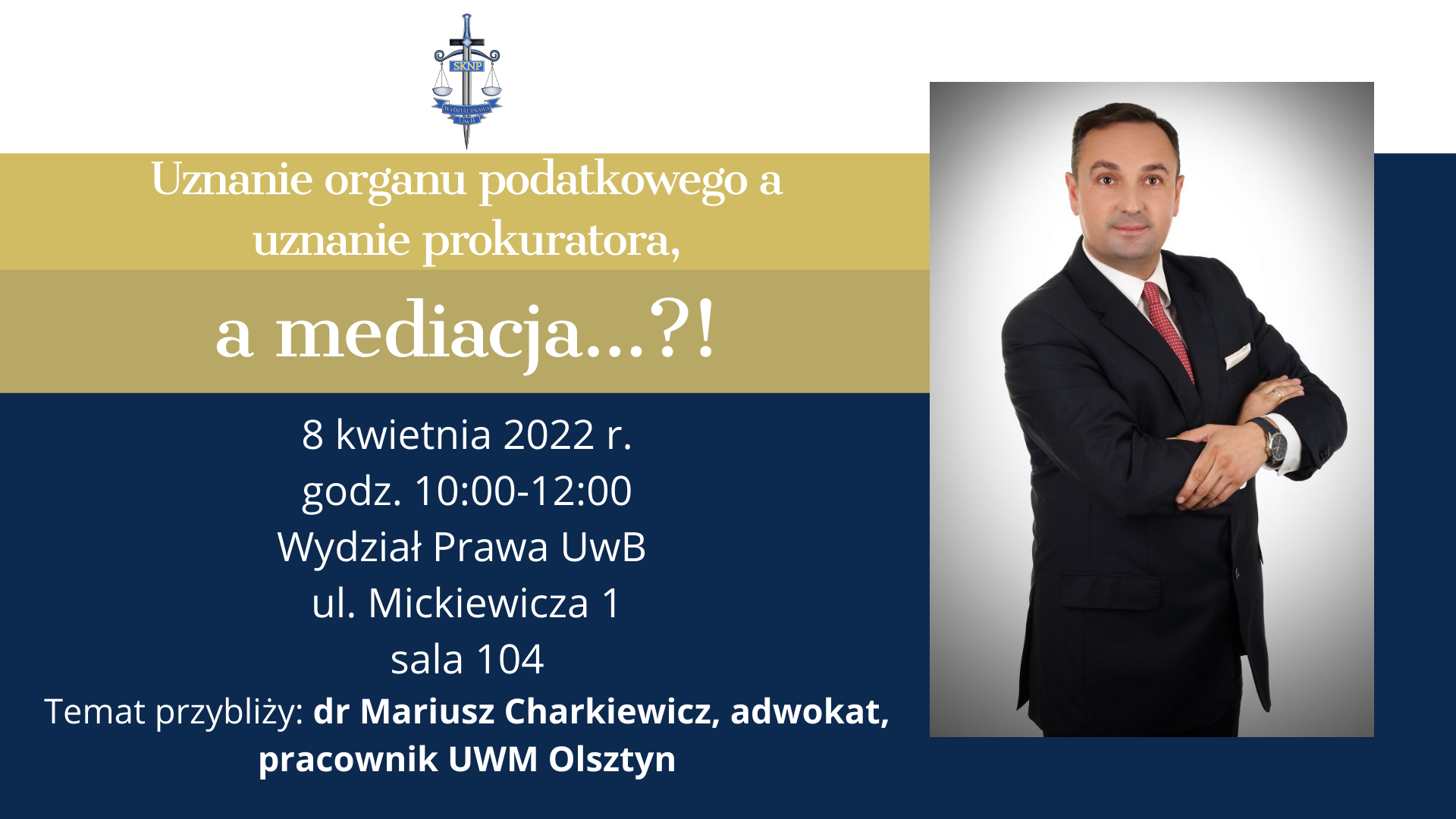 Przeprowadzony w dniu 8 kwietnia 2022 r. na Wydziale Prawa Uniwersytetu w Białymstoku wykład na temat "Uznanie organu podatkowego, a uznanie prokuratora, a mediacja"