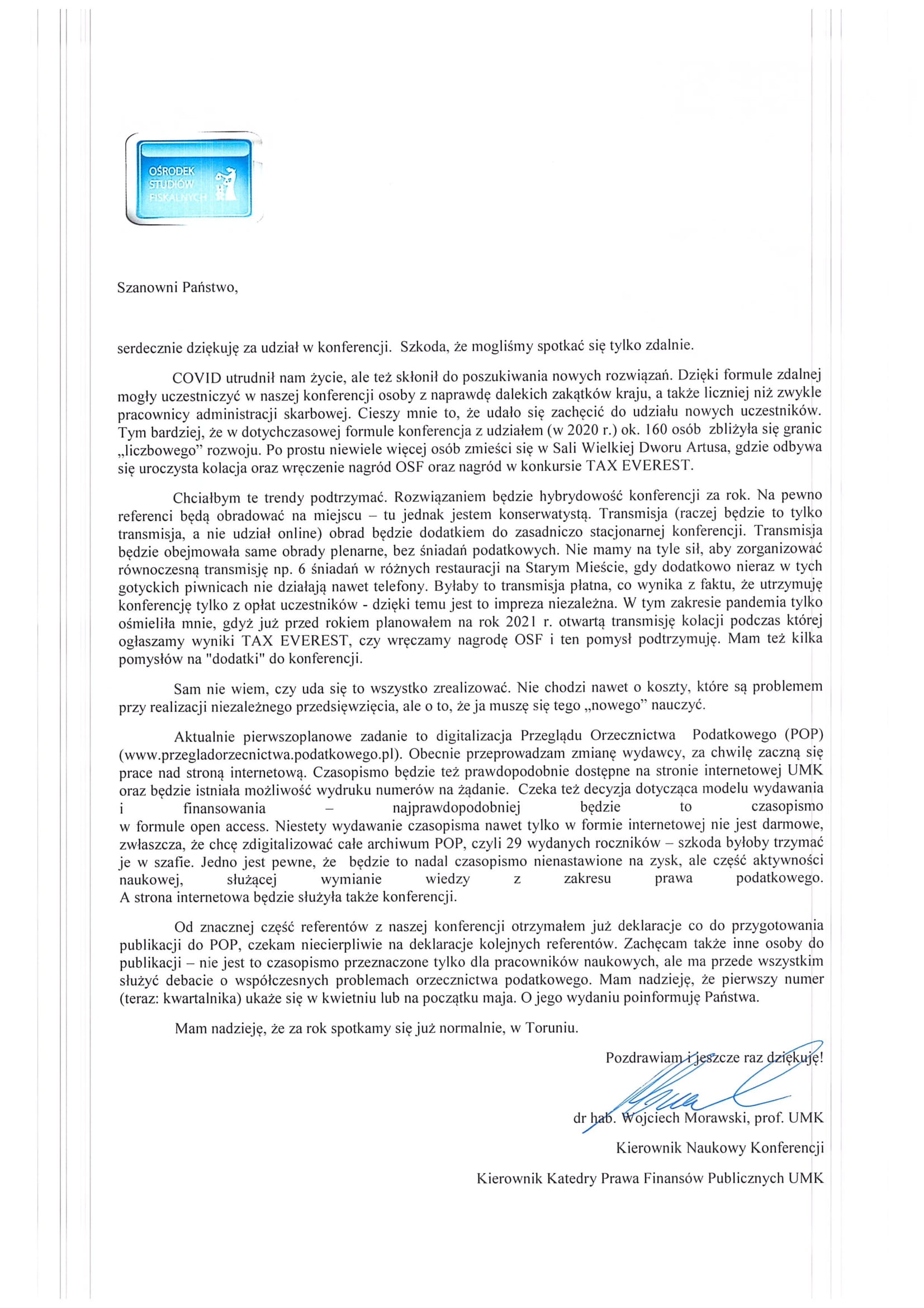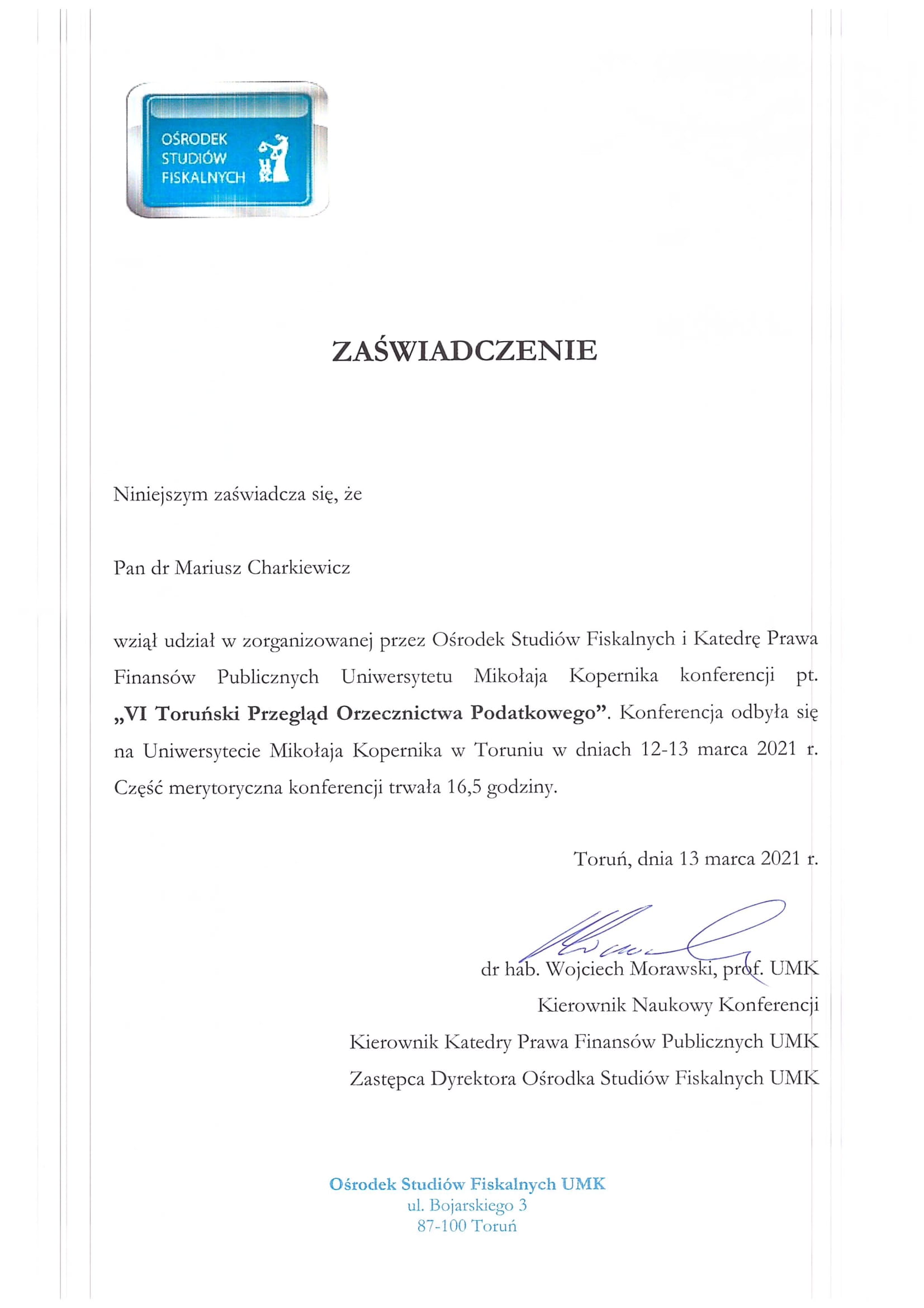Udział w dniu 12-13 marca 2021 r. w konferencji pt. "VI Toruński Przegląd Orzecznictwa Podatkowego" zorganizowanej przez Ośrodek Studiów Fiskalnych i Katedrę Prawa Finansów Publicznych Wydział Prawa i Administracji Uniwersytetu Mikołaja Kopernika w Toruniu.