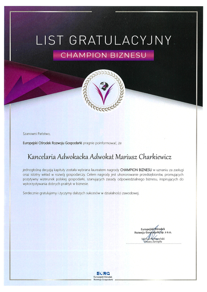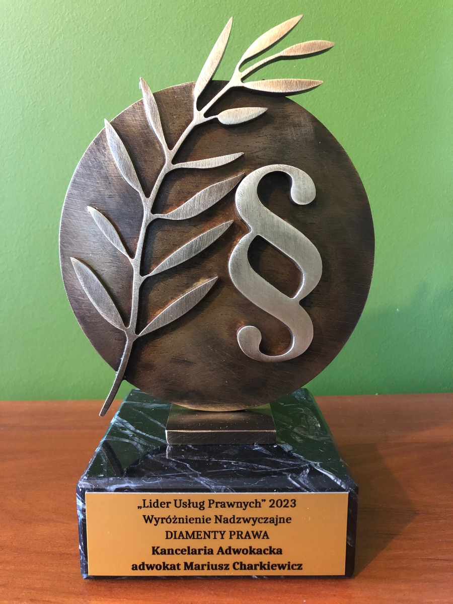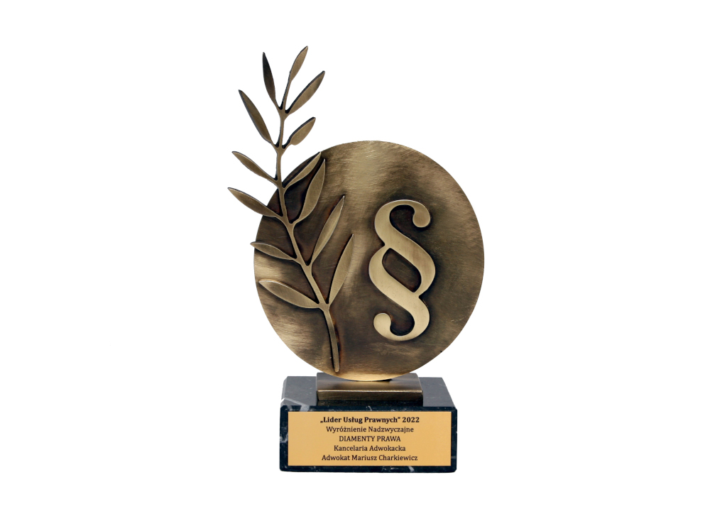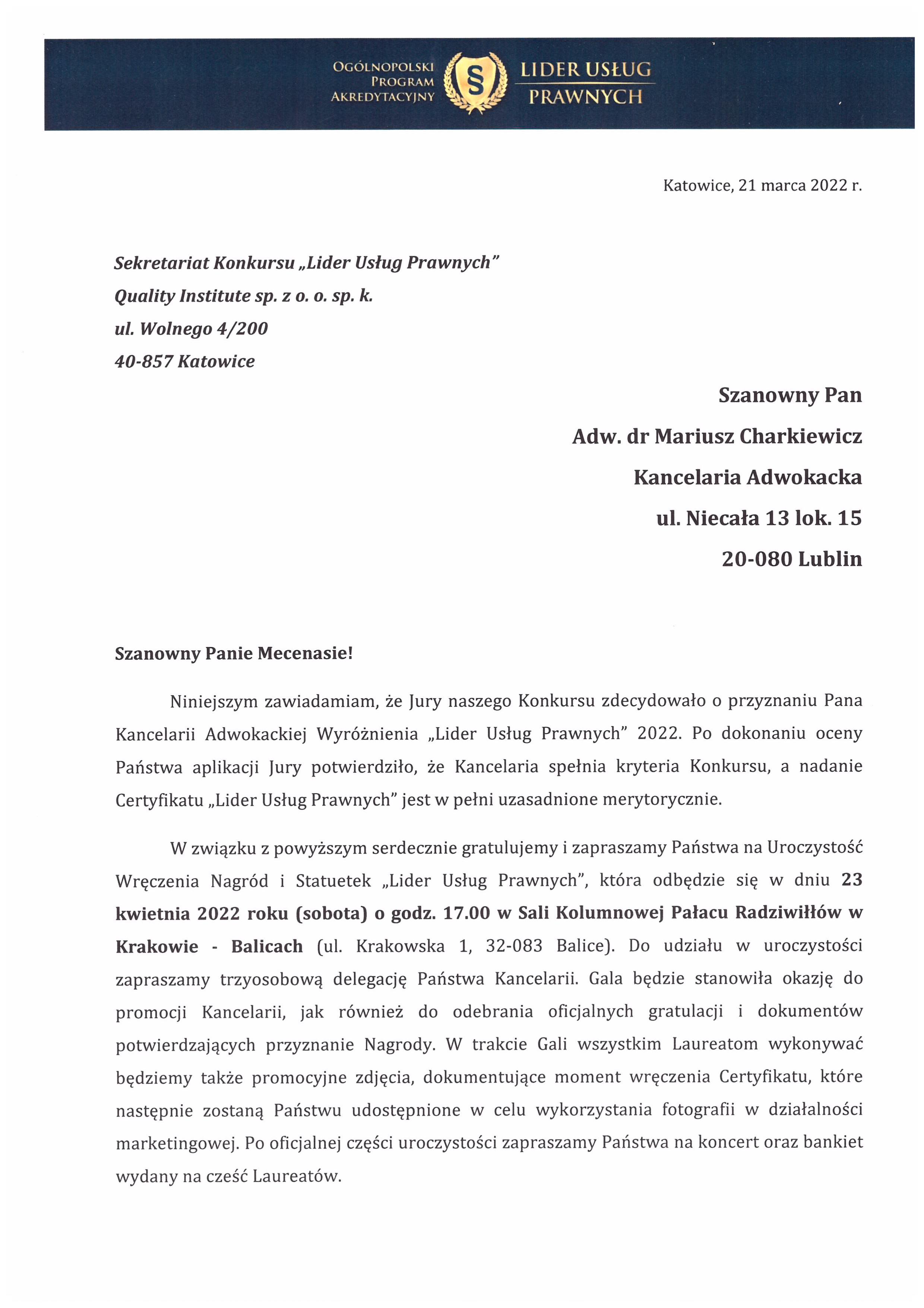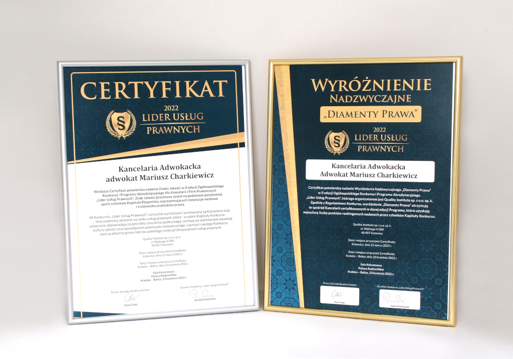 Uhonorowanie Kancelarii Adwokata Mariusza Charkiewicza Certyfikatem Lidera Usług Prawnych 2022 r. oraz Nadzwyczajnym Wyróżnieniem "DIAMENTY PRAWA"