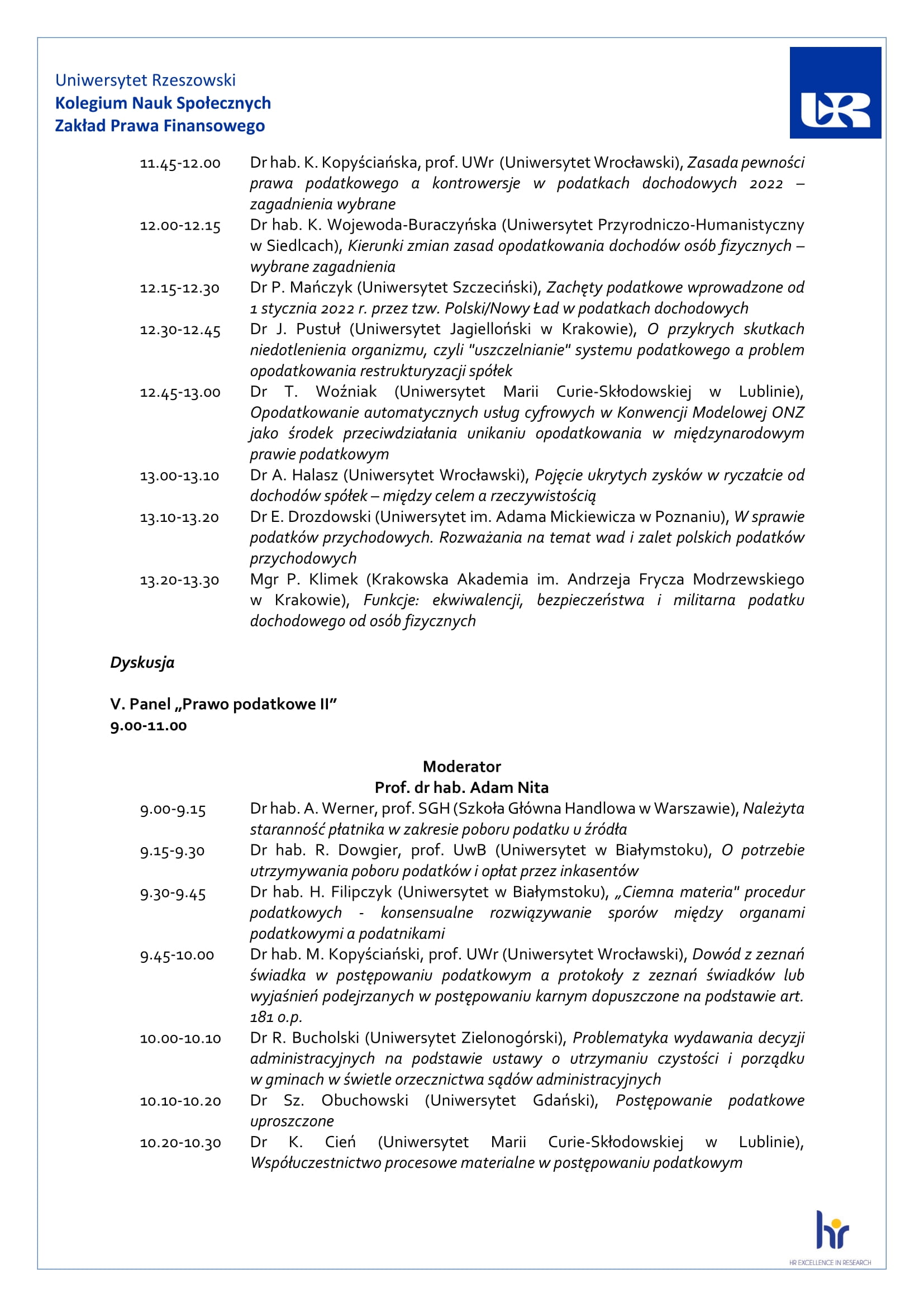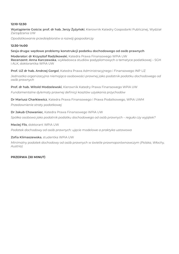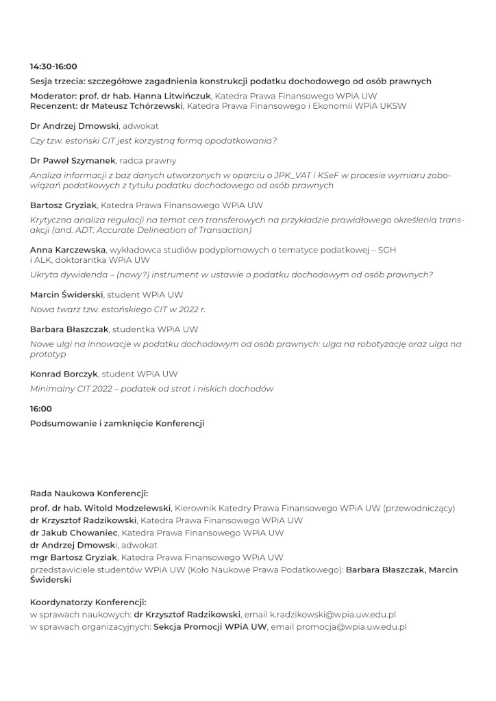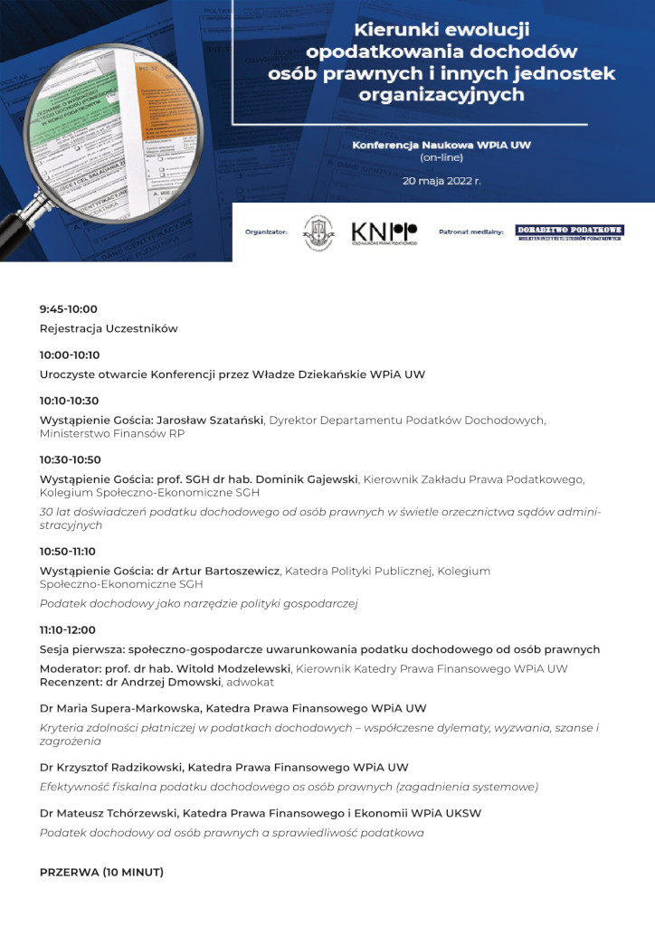 Udział w dniu 20 maja 2022 r. w Konferencji Naukowej WPiA Uniwersytetu Warszawskiego nt. Kierunki ewolucji opodatkowania dochodów osób prawnych i innych jednostek organizacyjnych - wygłoszony referat nt. "Przedawnienie straty podatkowej w podatku dochodowym od osób prawnych"
