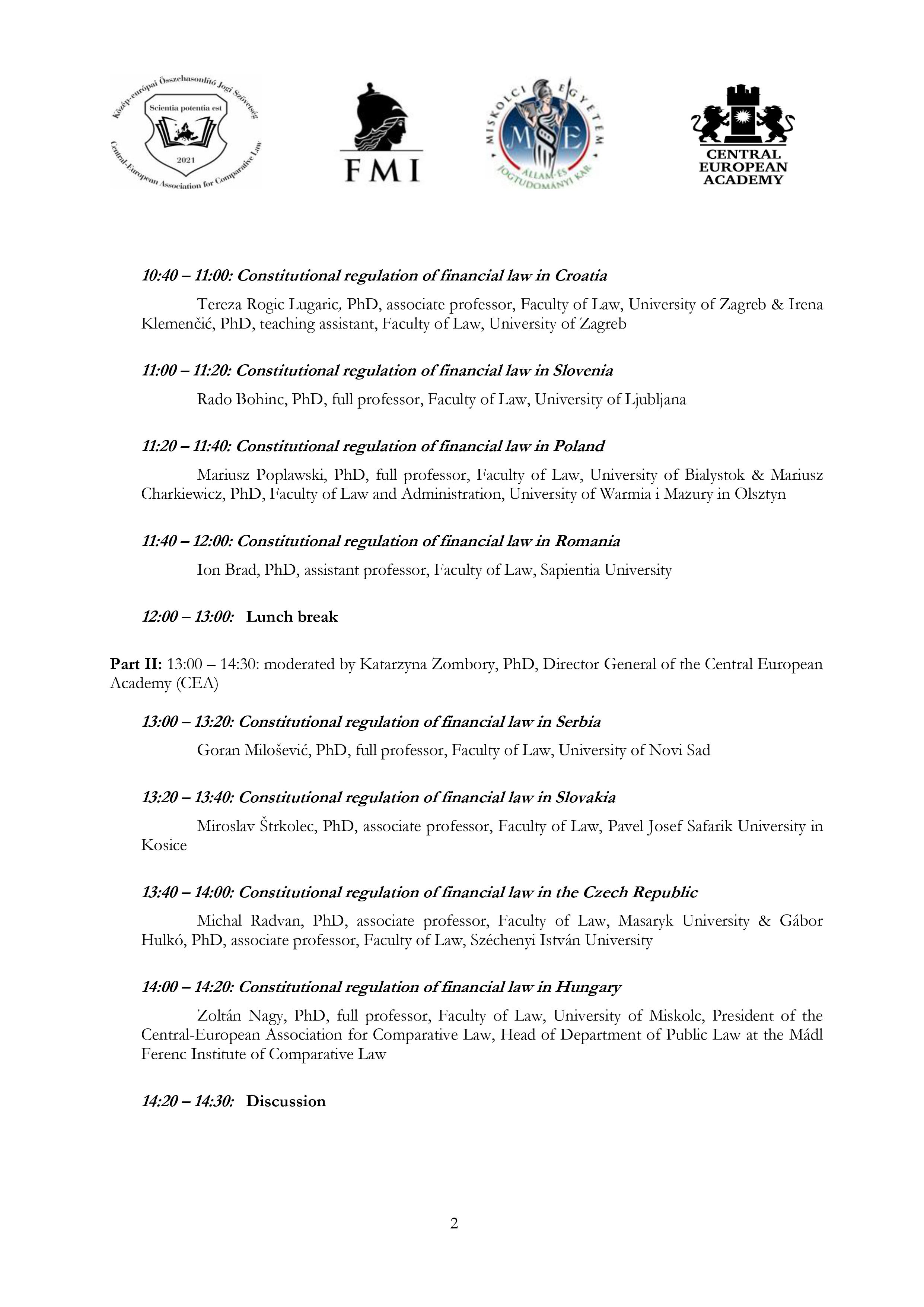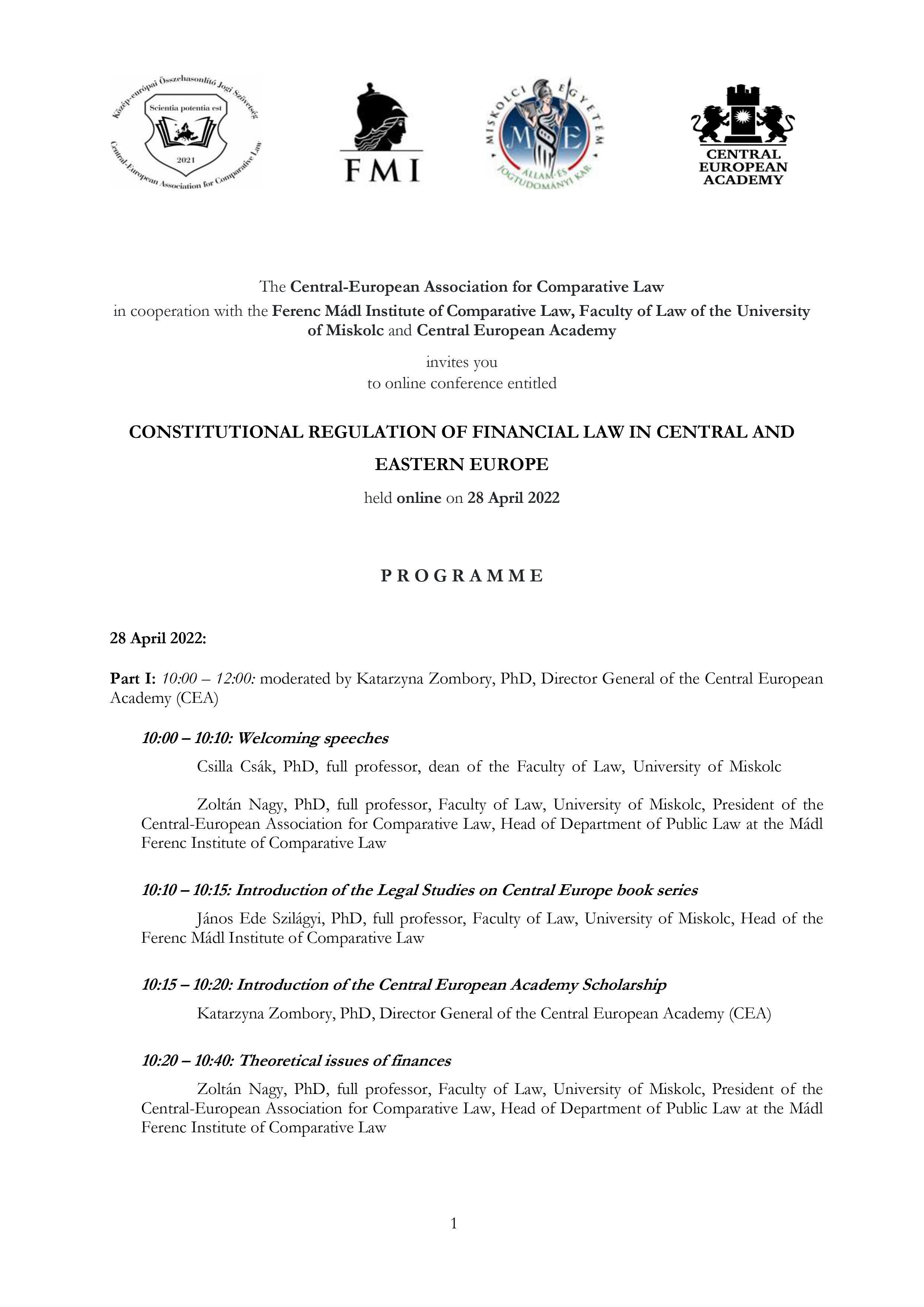 Wystąpienie w dniu 28 kwietnia 2022 r. na międzynarodowej konferencji nt. CONSTITUTIONAL REGULATION OF FINANCIAL LAW IN CENTRAL AND EASTERN EUROPE zorganizowanej przez The Central-European Association for Comparative Lawmin cooperation with the Ferenc Mádl Institute of Comparative Law, Faculty of Law of the University of Miskolc and Central European Academy