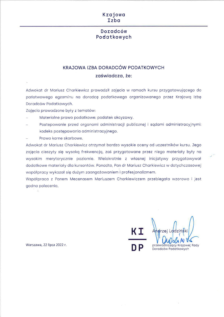 Zaświadczenie z lipca 2022 roku, wydane przez Krajową Izbę Doradców Podatkowych