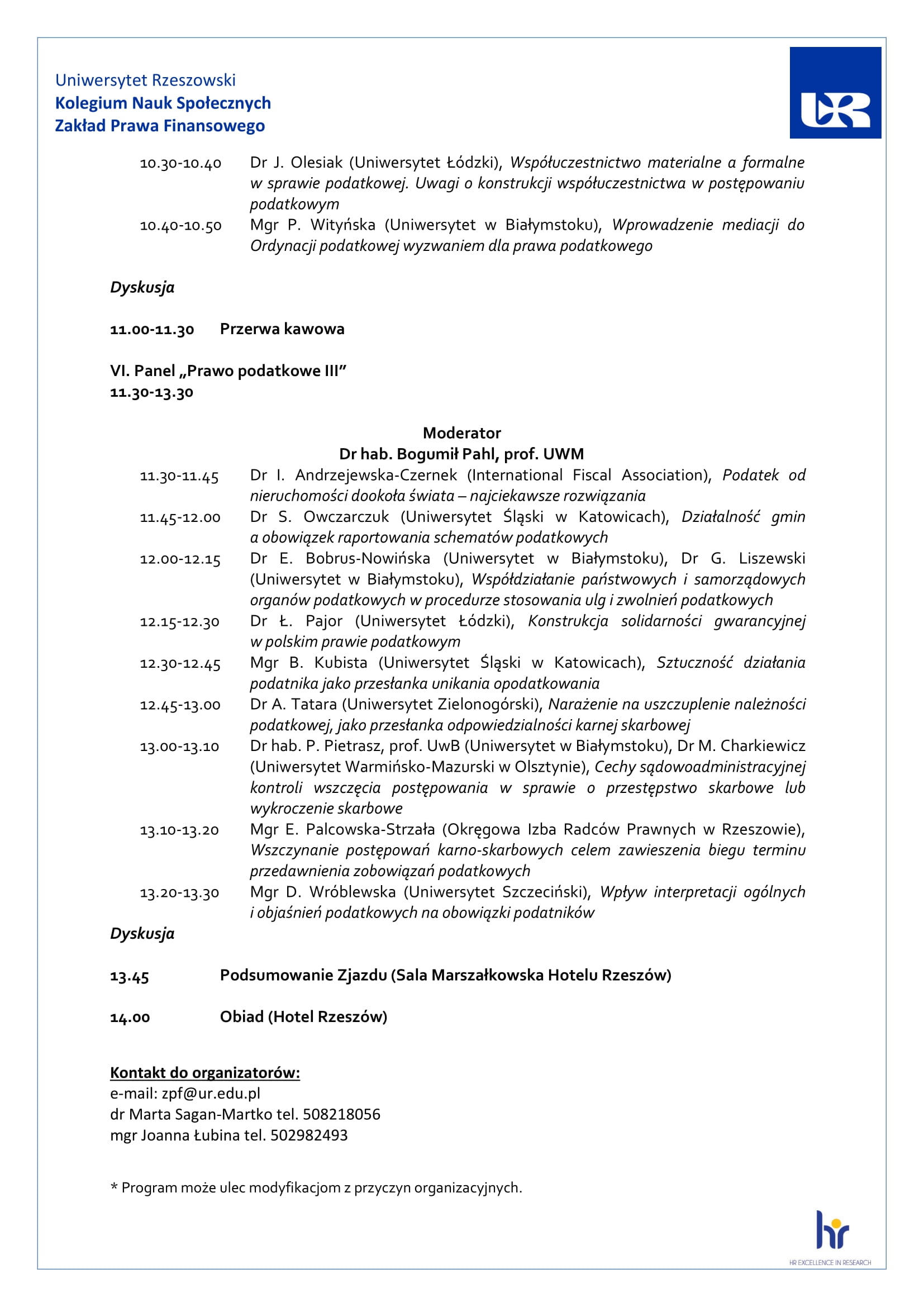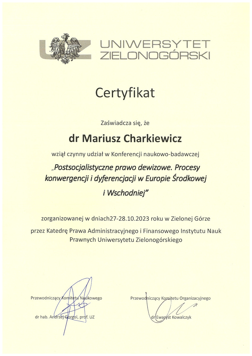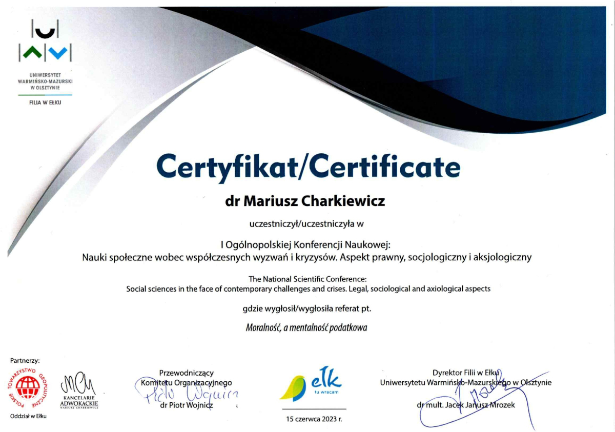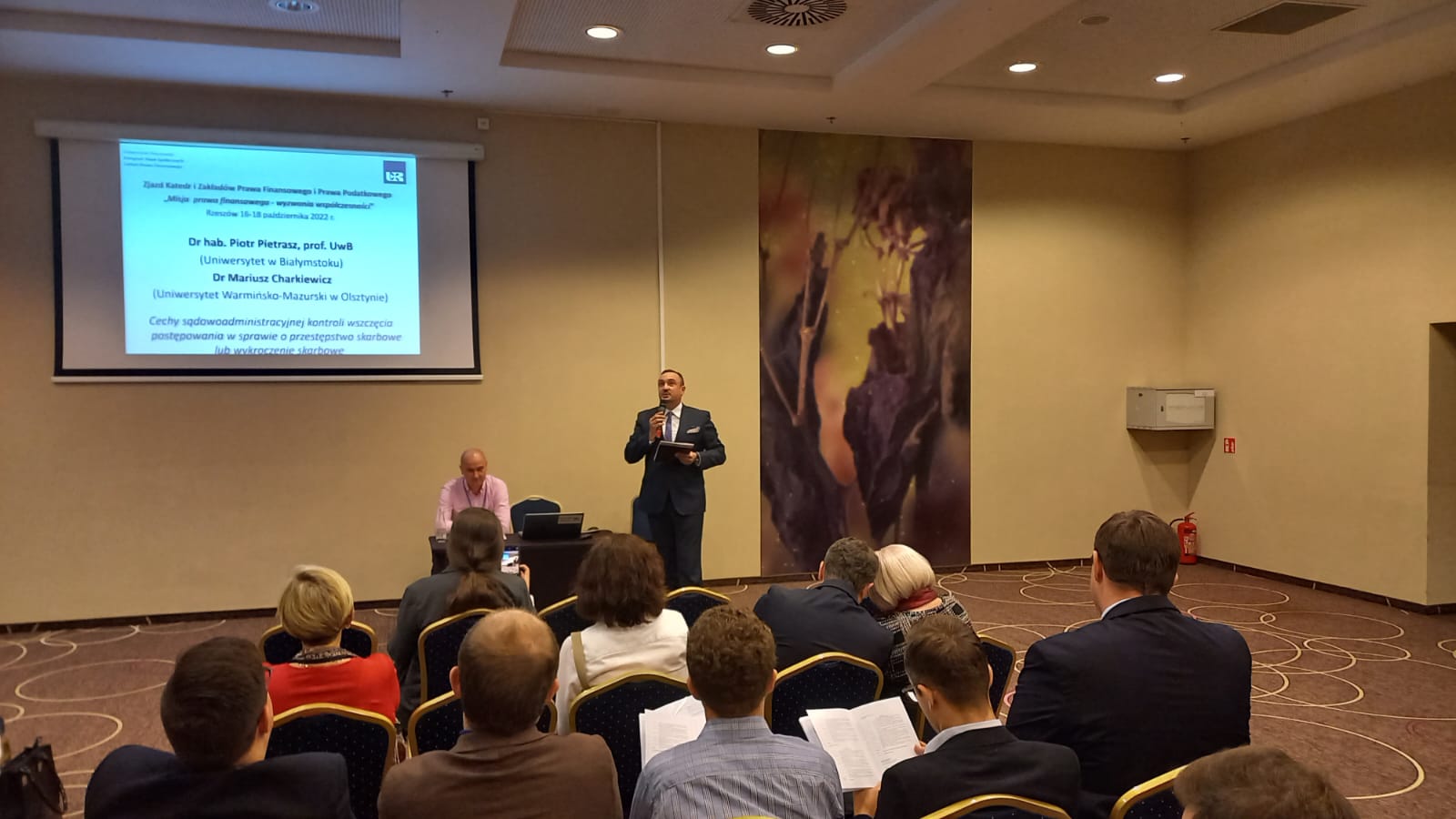 Zjazd Katedr i Zakładów Prawa Finansowego i Prawa Podatkowego "Misja prawa finansowego - wyzwania współczesności". Wygłoszony referat na temat: "Cechy sądowoadministracyjnej kontroli wszczęcia postępowania w sprawie o przestępstwo skarbowe lub wykroczenie skarbowe" przez adw. dr Mariusza Charkiewicza w imieniu własnym oraz w imieniu dr hab. Piotra Pietrasza, prof. UwB.