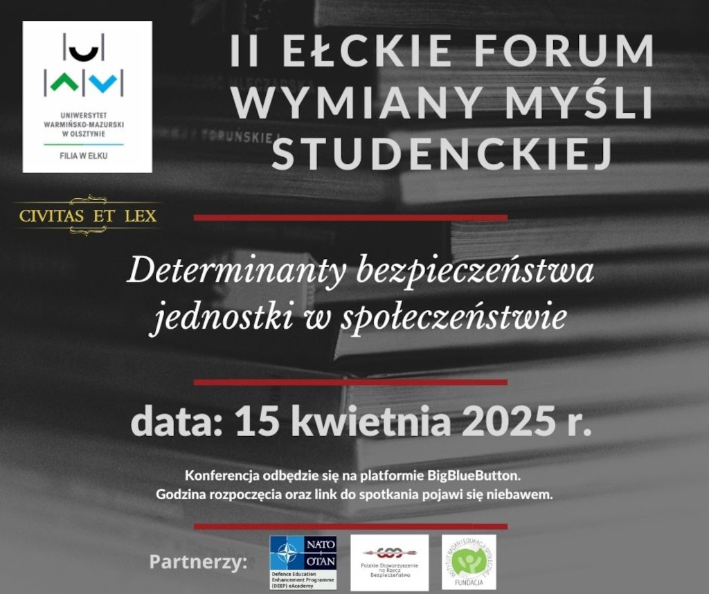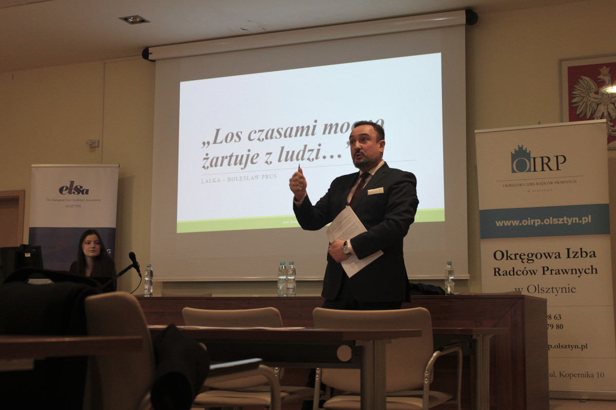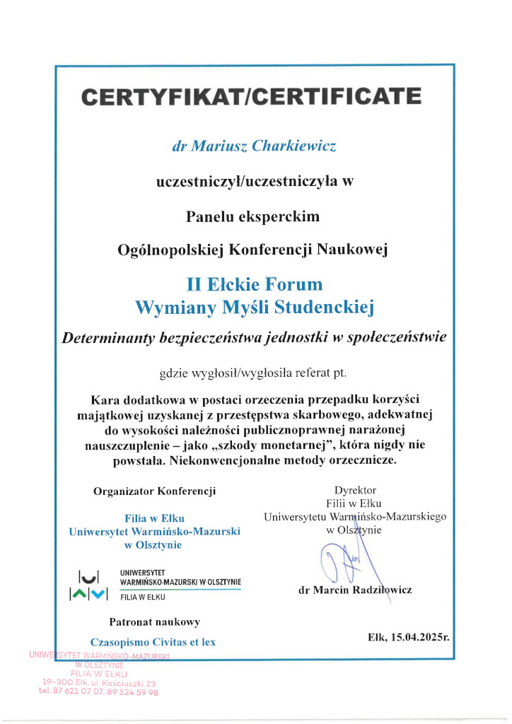 Udział w II Ełckim Forum Wymiany Myśli Studenckiej "Determinanty bezpieczeństwa jednostki w społeczeństwie" - wygłoszony referat nt. "Kara dodatkowa w postaci orzeczenia przepadku korzyści majątkowej uzyskanej z przestępstwa skarbowego, adekwatnej do wysokości należności publicznoprawnej narażonej na uszczuplenie - jako "szkody monetarnej", która nigdy nie powstała. Niekonwencjonalne metody orzecznicze" - w formie hybrydowej