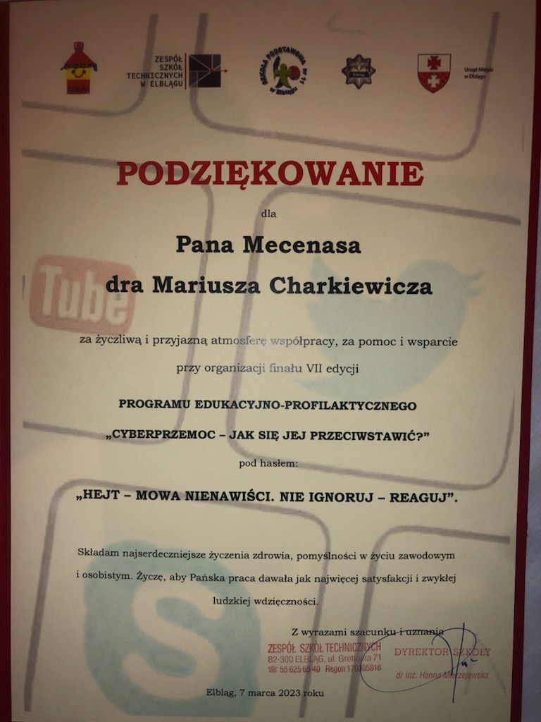 Udział w finale VII edycji Programu Edukacyjno-Profilaktycznego "Cyberprzemoc- jak się jej przeciwstawiać?" zorganizowanym przez Prezydenta Miasta Elbląga oraz Dyrektora Zespołu Szkół Technicznych w Elblągu. Wygłoszony referat na temat "Hejt - mowa nienawiści. Nie ignoruj- Reaguj."