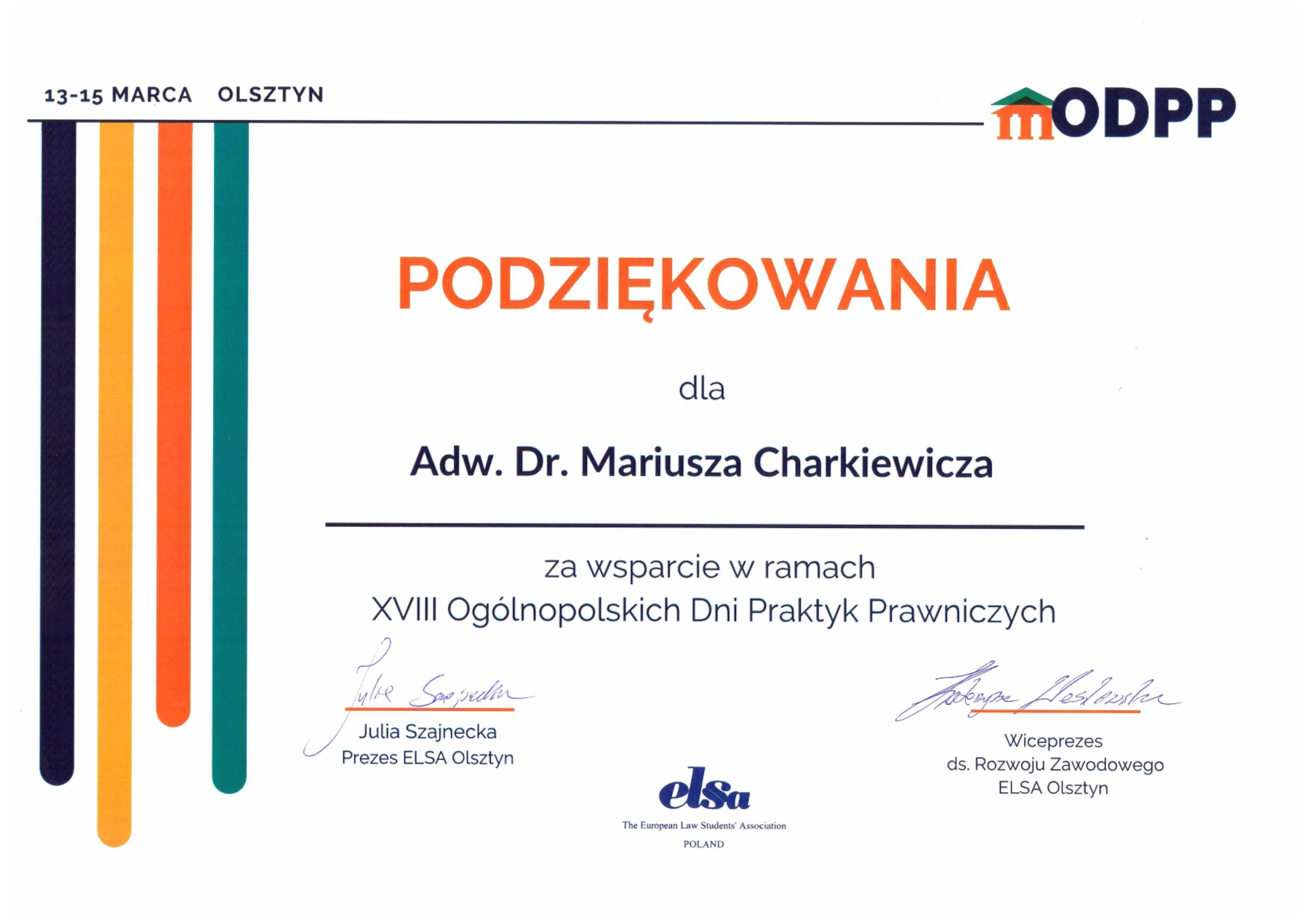 Uhonorowanie Kancelarii Adwokackich adw. Mariusza Charkiewicza