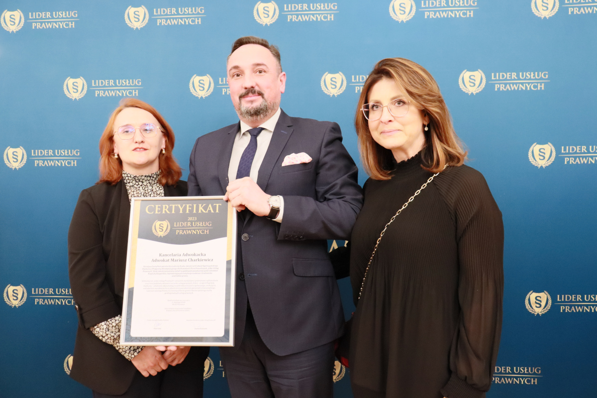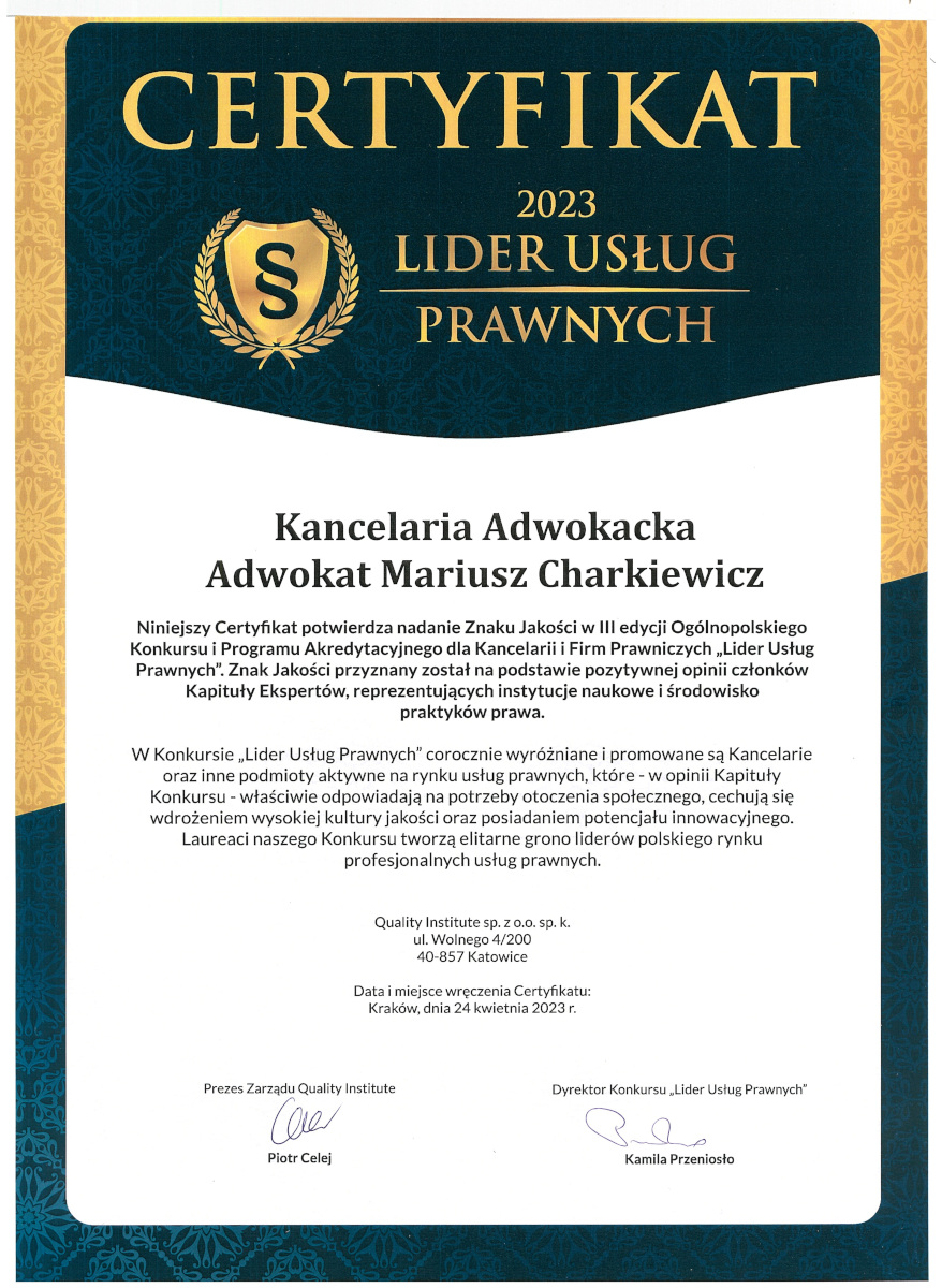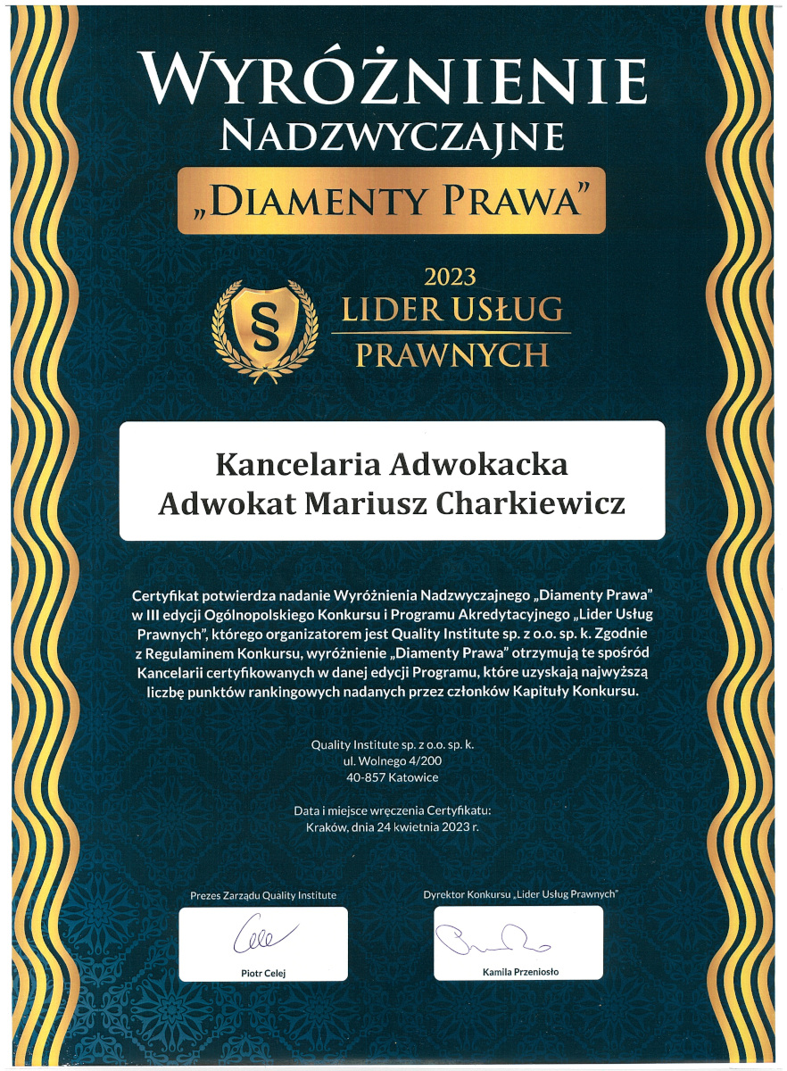 Uhonorowanie Kancelarii Adwokata Mariusza Charkiewicza Certyfikatem Lidera Usług Prawnych 2023r. oraz Nadzwyczajnym Wyróżnieniem "DIAMENTY PRAWA"