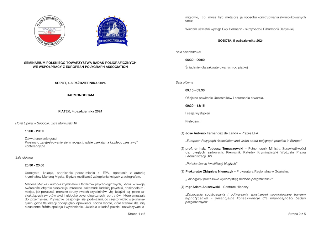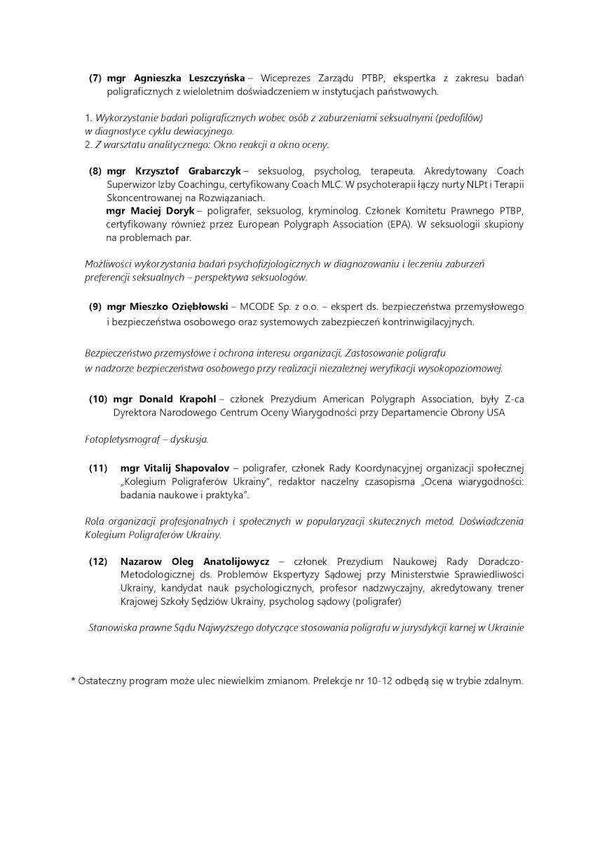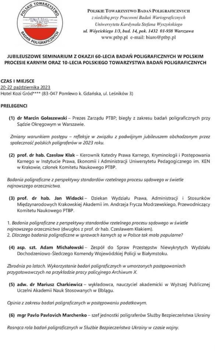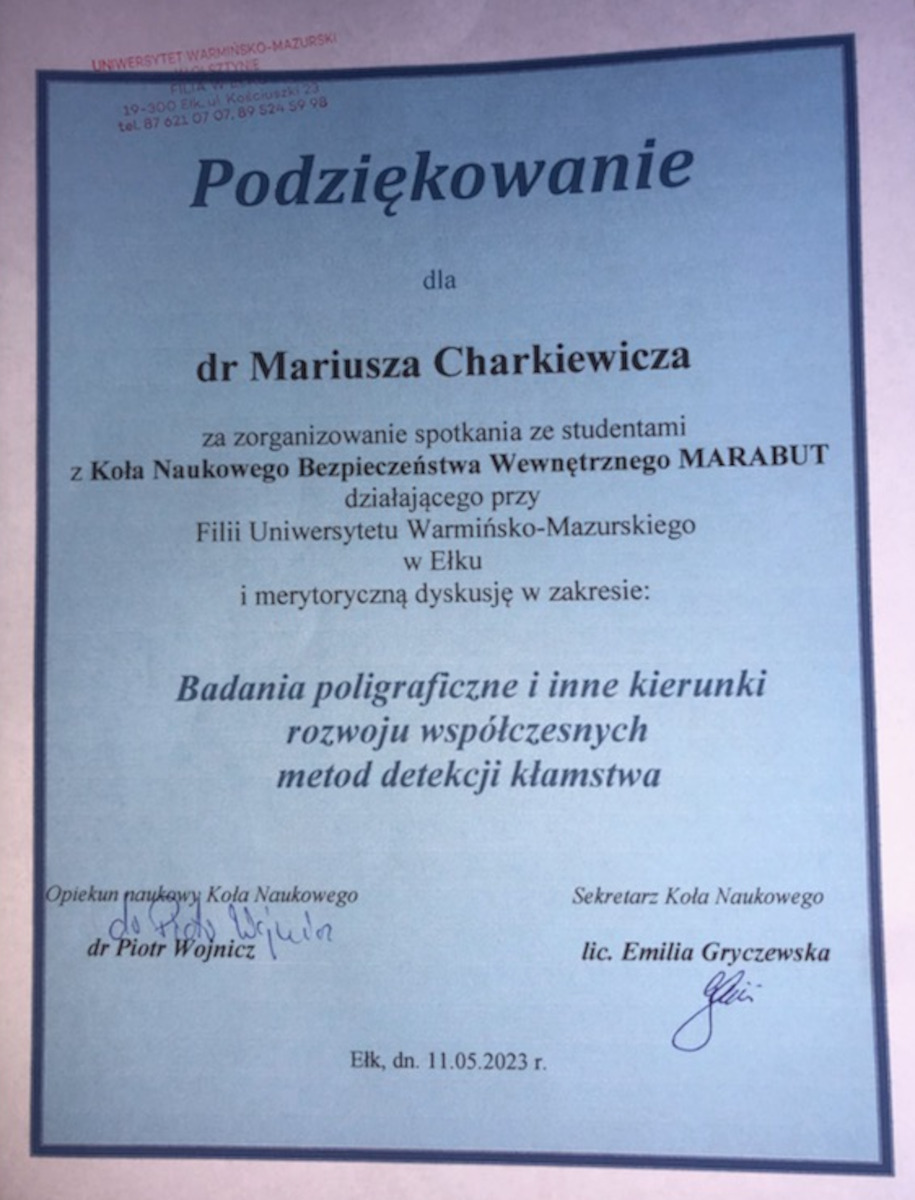 Udział w Seminarium Polskiego Towarzystwa Badań Poligraficznych we współpracy z European Polygraph Association, wygłoszony referat Adw. dr Mariusz Charkiewicz nt. "Wykorzystanie ekspertyzy "prywatnej" z zakresu badań poligraficznych w celu realizacji prawa do obrony",