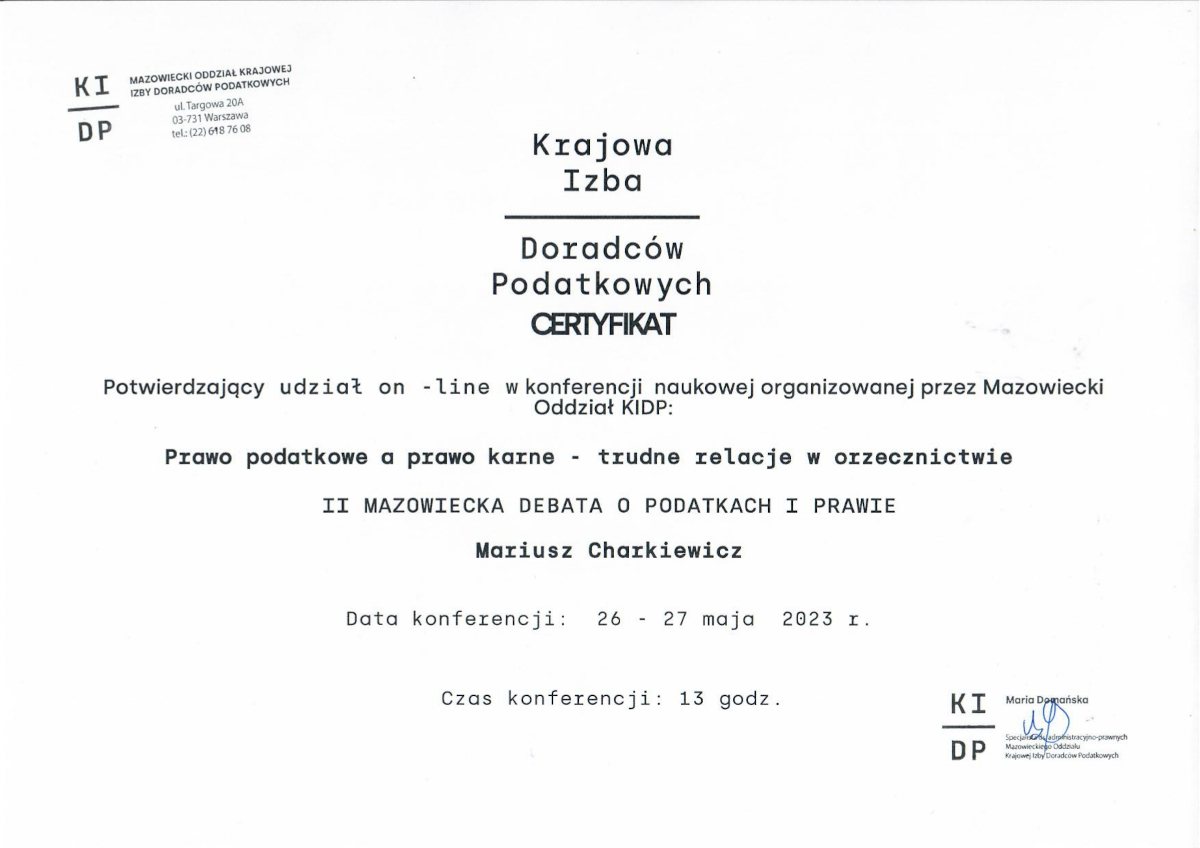 Uczestnik II Mazowieckiej debaty o podatkach i prawie "Prawo podatkowe a prawo karne - trudne relacje w orzecznictwie"