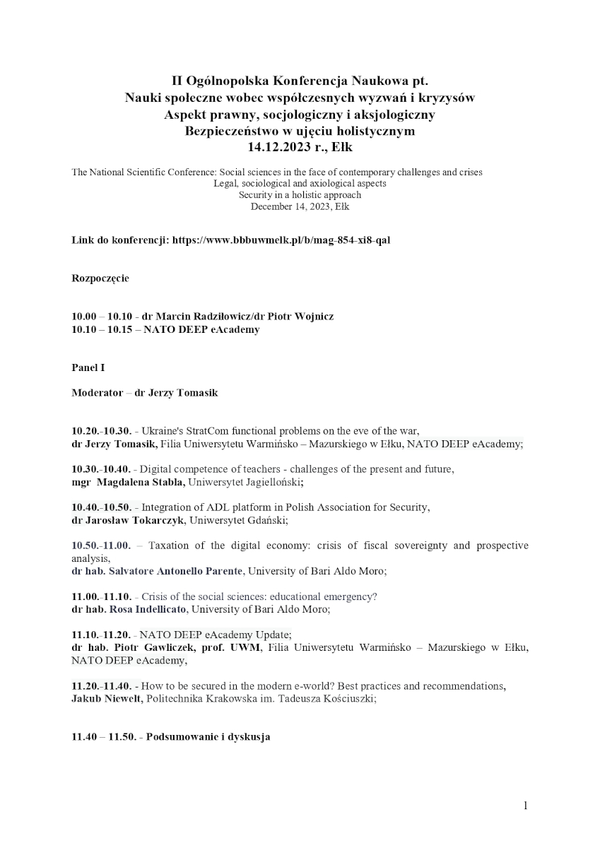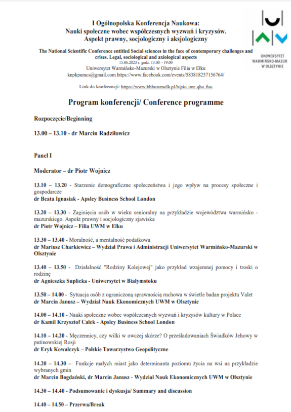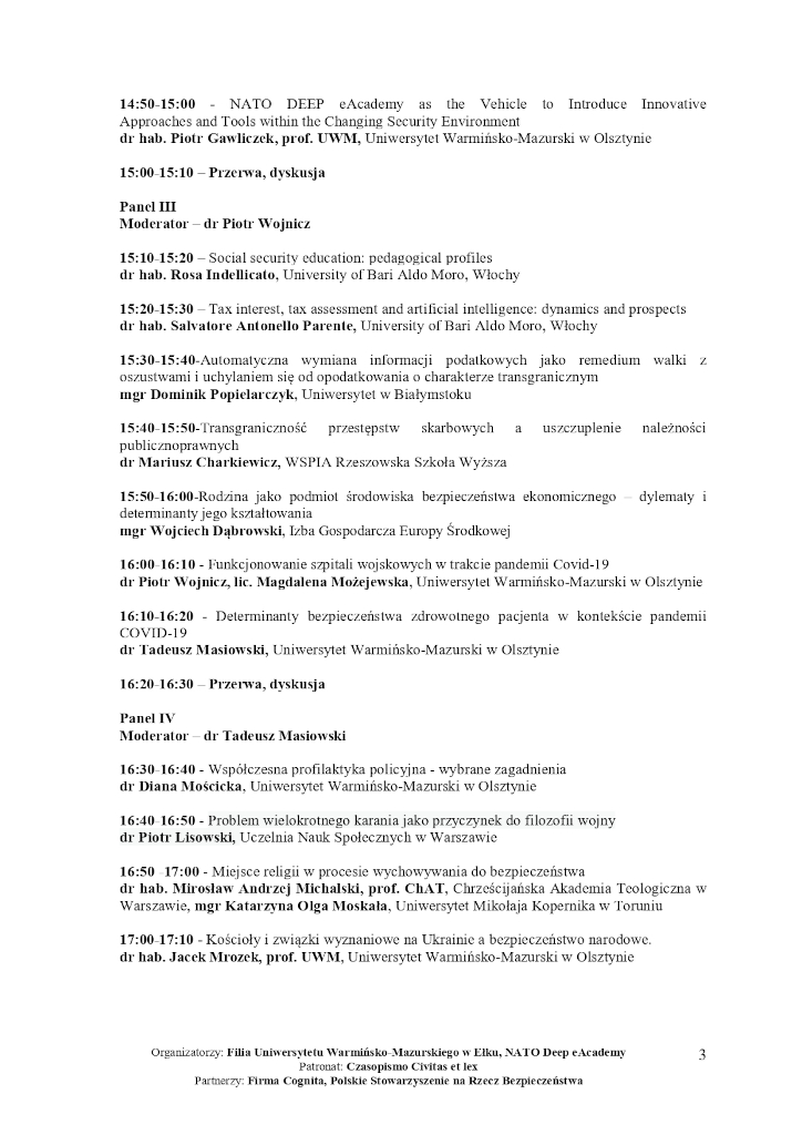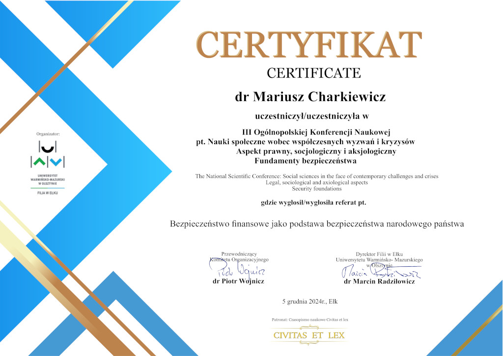 Udział w III Ogólnopolskiej Konferencji Naukowej "Nauki społeczne wobec współczesnych wyzwań i kryzysów Aspekt prawny, socjologiczny i aksjologiczny Fundamenty bezpieczeństwa" - Wygłoszony referat nt. "Bezpieczeństwo finansowe jako podstawa bezpieczeństwa narodowego państwa" - w formie hybrydowej".