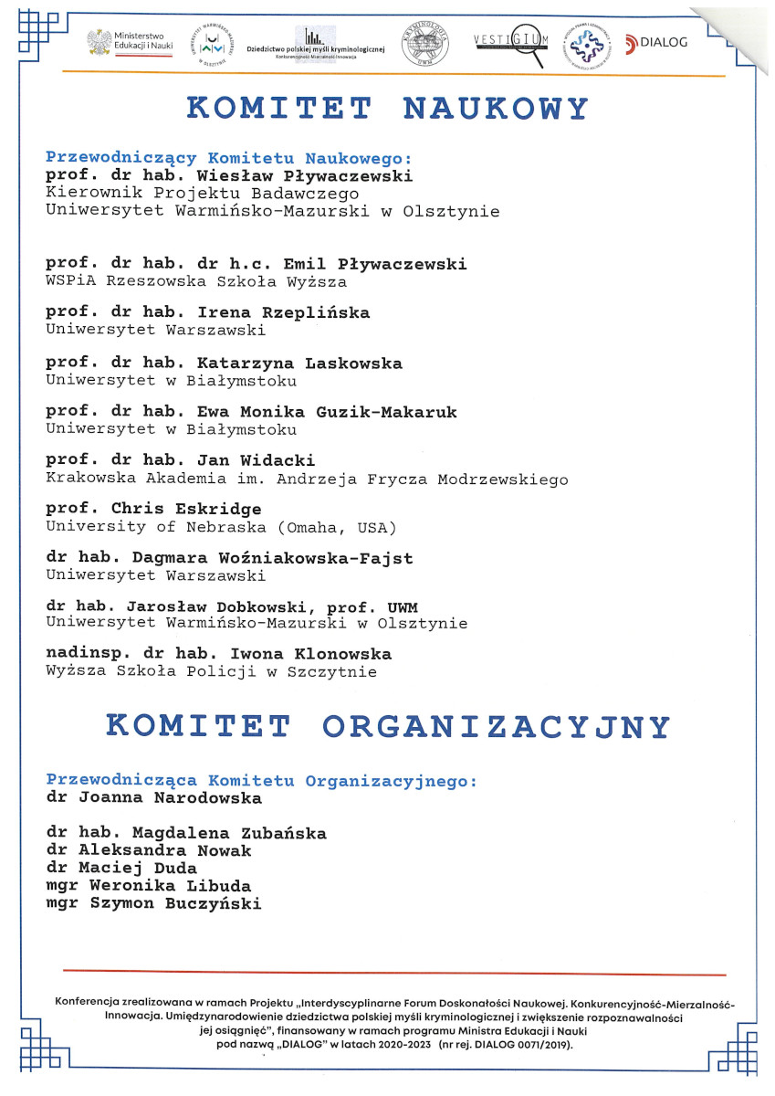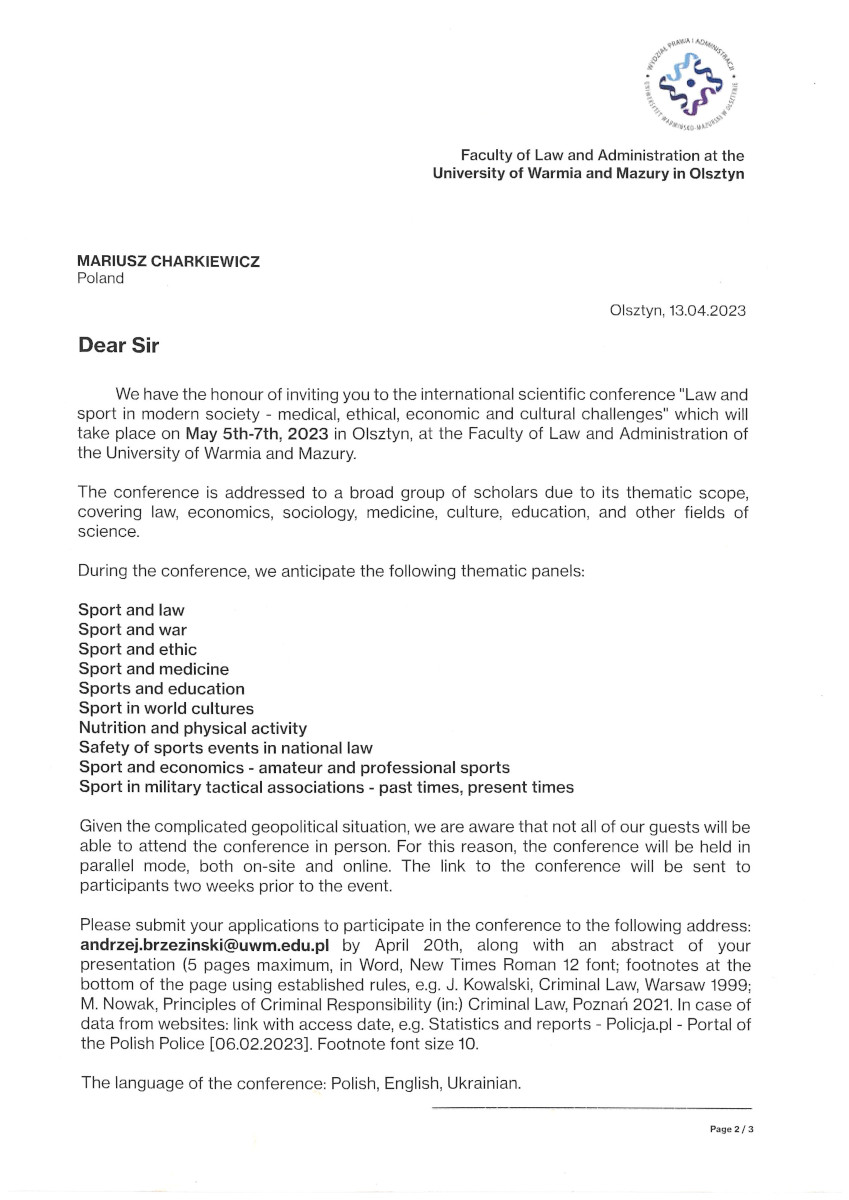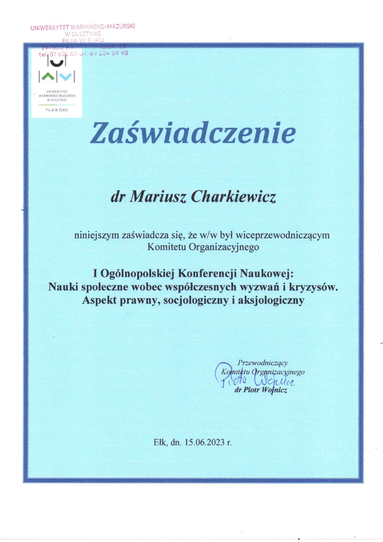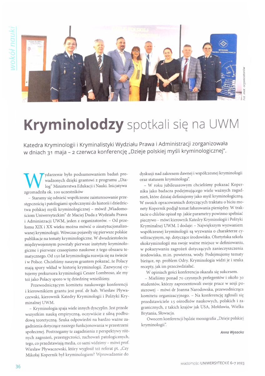 Konferencja ,,Dzieje polskiej myśli kryminologicznej" zorganizowana w Olsztynie w dniach 31 maja -2 czerwca 2023 r. przez Katedrę Kryminologii i Kryminalistyki Wydziału Prawa i Administracji z udziałem adw. dr Mariusza Charkiewicza - tematem artykułu opublikowanego w czasopiśmie Uniwersytetu Warmińsko – Mazurskiego w Olsztynie „Wiadomości Uniwersyteckie” nr 6-7 czerwiec-lipiec 2023 r.