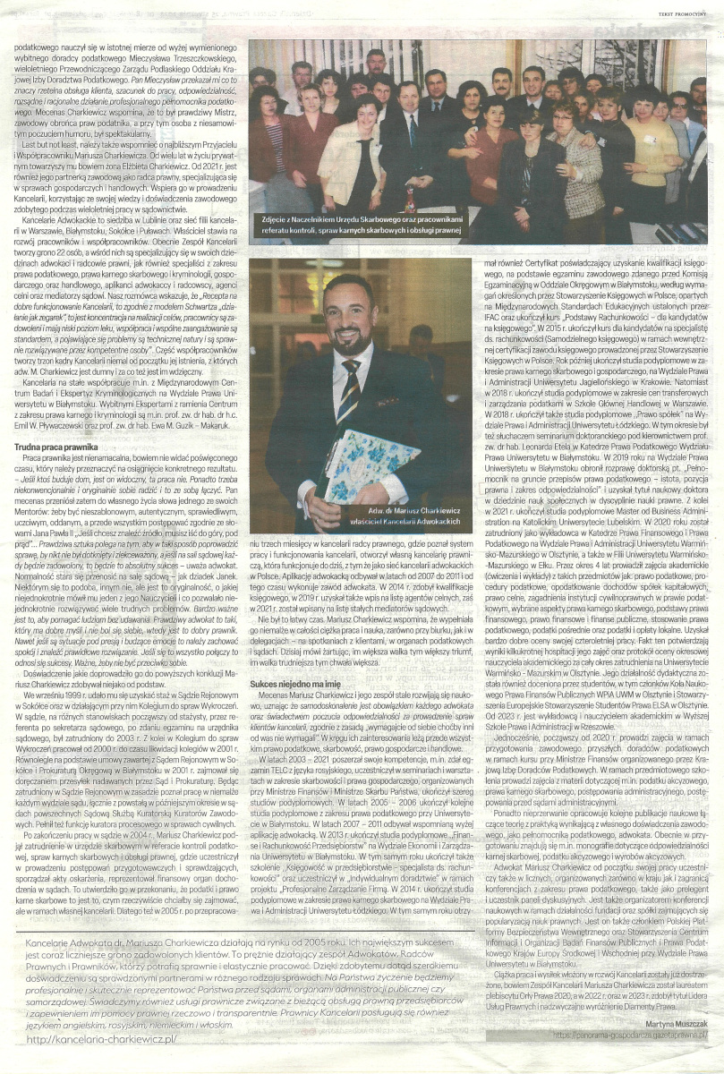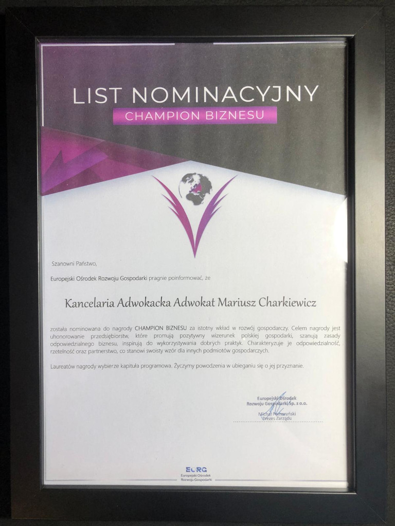 Uhonorowanie Kancelarii Adwokackich Adwokata Mariusza Charkiewicza Laureatem Nagrody