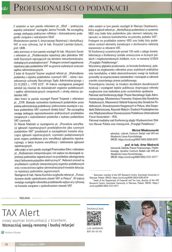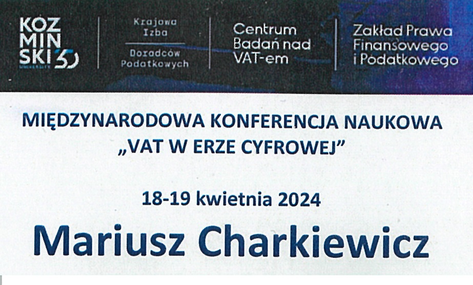 Czynny udział w Międzynarodowej Konferencji Naukowej „VAT w Erze Cyfrowej” zorganizowanej przez Zakład Prawa Finansowego i Podatkowego, Centrum Badań nad VAT-em Akademii Leona Koźmińskiego, pod patronatem Naczelnego Sądu Administracyjnego - wygłoszony referat nt. „Identyfikacja podatników w systemie VIES oraz biała lista podatników jako element należytej staranności w doborze kontrahentów na potrzeby podatku VAT”.