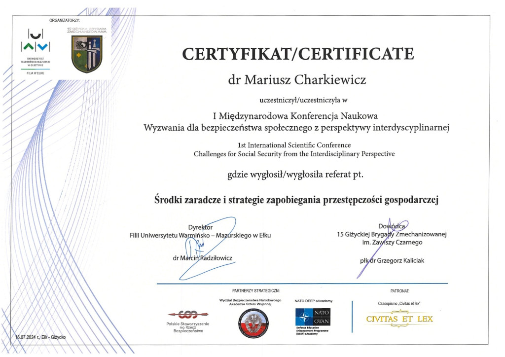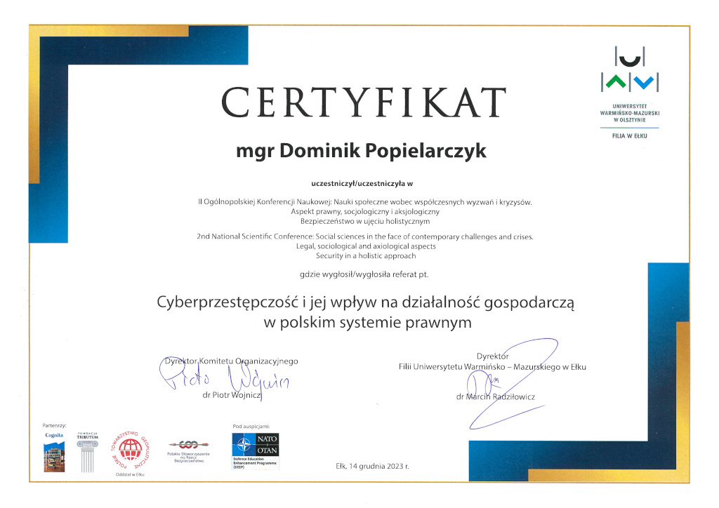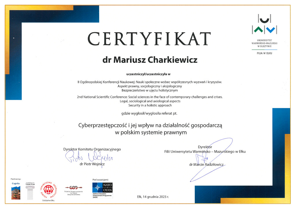Bezpieczeństwo w ujęciu holistycznym" - Wygłoszony referat nt. " Cyberprzestępczość i jej wpływ na działalność gospodarczą w polskim systemie prawnym" - w formie hybrydowej.