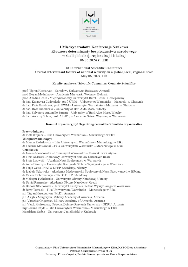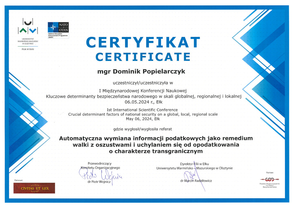 Udział przedstawicieli kancelarii w I Międzynarodowej Konferencji Naukowej "Kluczowe determinanty bezpieczeństwa narodowego w skali globalnej, regionalnej i lokalnej" - Wygłoszone referaty nt. "Automatyczna wymiana informacji podatkowych jako remedium walki z oszustwami i uchylaniem się od opodatkowania o charakterze transgranicznym" oraz "Transgraniczność przestępstw skarbowych a uszczuplenie należności publicznoprawnych" - w formie hybrydowej.