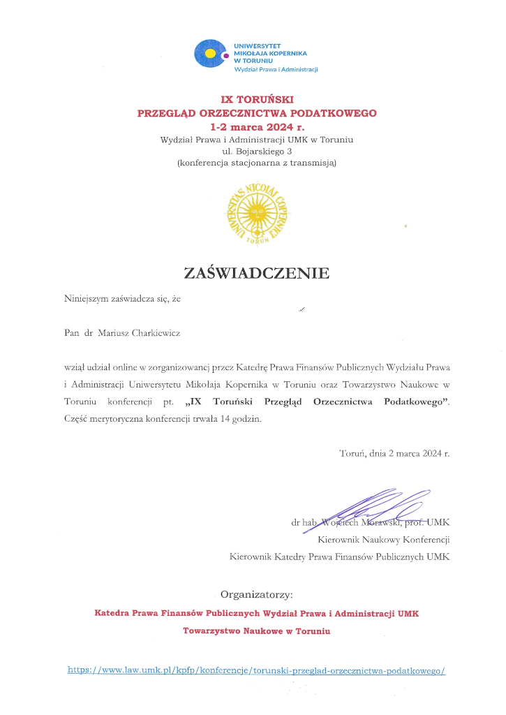 Czynny udział przedstawiciela Kancelarii Adwokackich adw. Mariusza Charkiewicza w IX Toruńskim Przeglądzie Orzecznictwa Podatkowego zorganizowanego przez Katedrę Prawa Finansów Publicznych Wydziału Prawa i Administracji UMK w Toruniu oraz Towarzystwo Naukowe w Toruniu.
