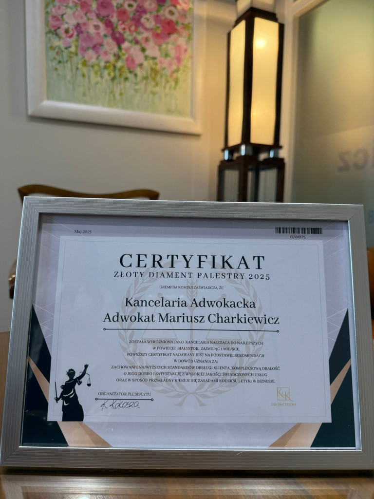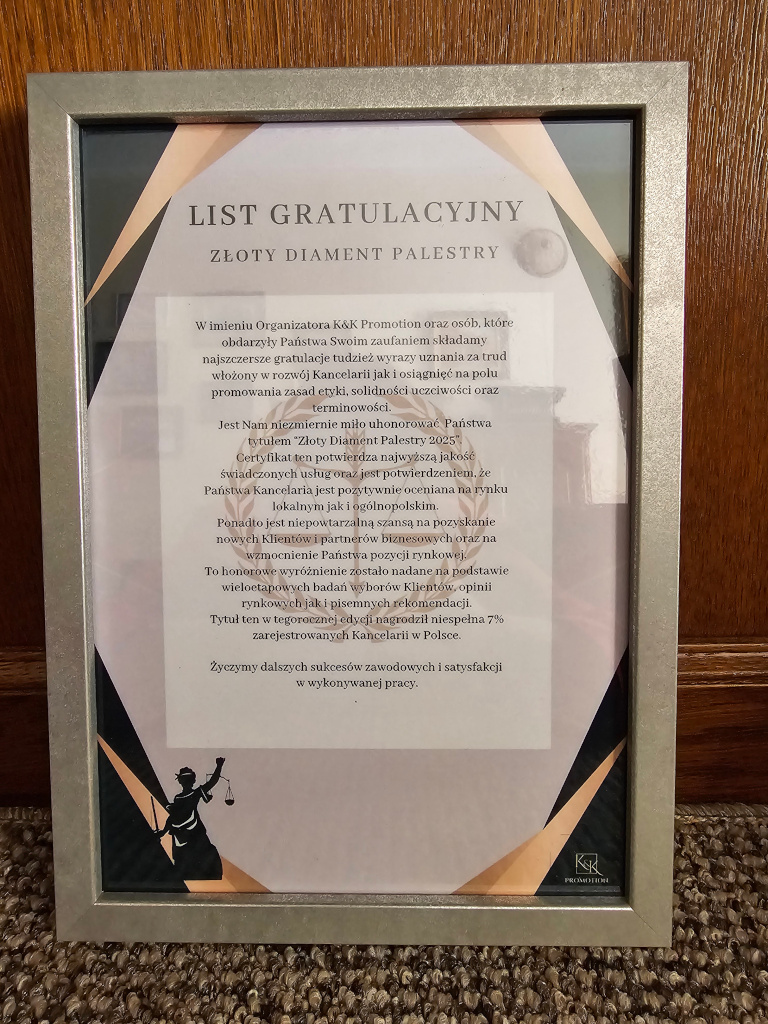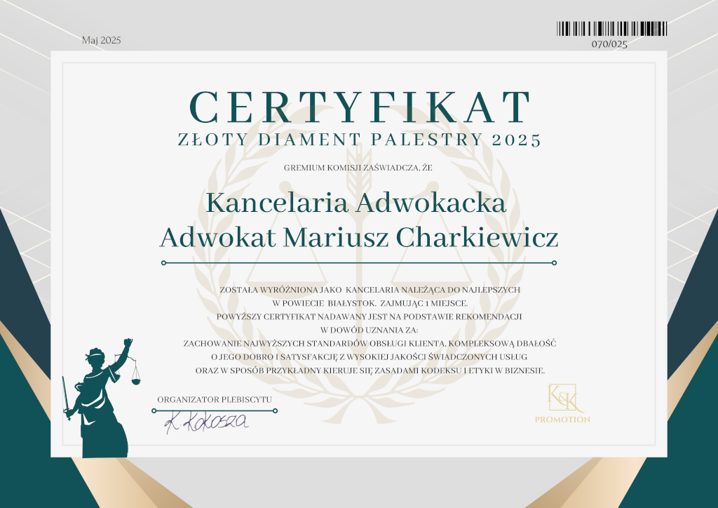 "Złotym Diamentem Palestry 2025" jako Kancelarii należącej do najlepszych w powiecie Białystok zajmując I miejsce.