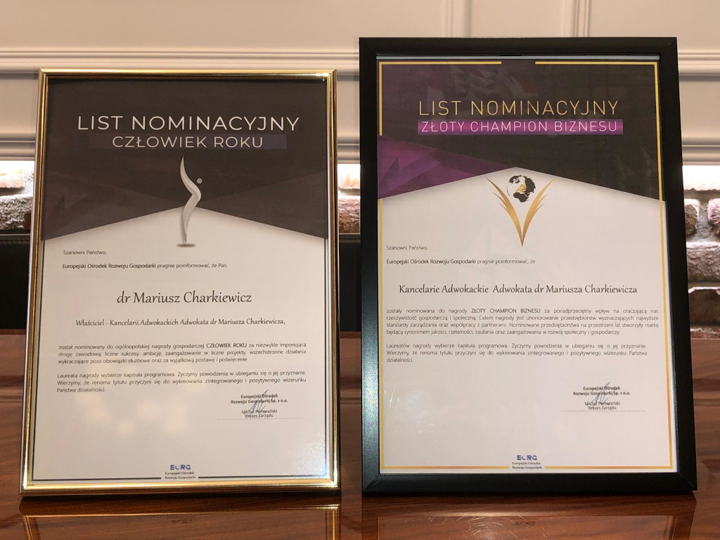 Wręczenie adw. dr Mariuszowi Charkiewiczowi listów nominacyjnych „Człowieka Roku” i „Złotego Championa Biznesu” przez przedstawicieli Europejskiego Ośrodka Rozwoju Gospodarki predysponujących do uzyskania przedmiotowych nagród